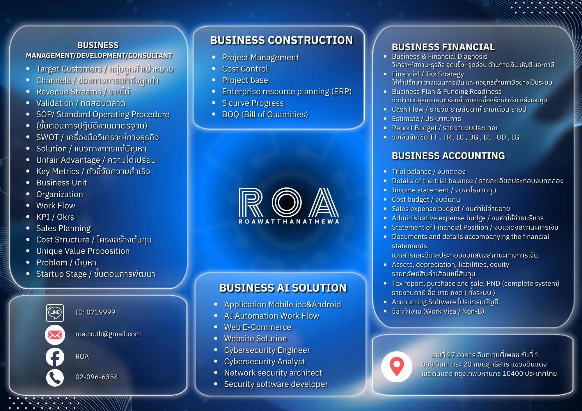 เราสามารถช่วยวางแผนและพัฒนาธุรกิจแบบครบวงจร ตั้งแต่ไอเดีย กลยุทธ์ ระบบงาน การเงินกและการบัญชี ไปจนถึงด้านเทคโนโลยีเพื่อให้ธุรกิจนั้นเติบโตอย่างเป็นระบบ